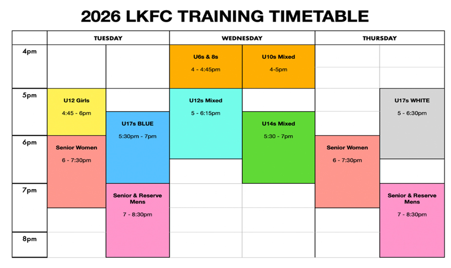 | U12’s (Females) & U15s (Females) | Tuesday | 4.45pm till 6.00pm |